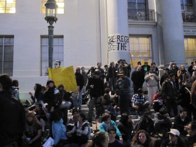 On tonight’s news, they featured various segments covering protests at Occupy Oakland, Occupy Los Angeles, Occupy Denver, Occupy Seattle, Occupy New York, Occupy Austin, Occupy Chicago, etc. And tonight I was also a part of “Occupy Cal”. And the university police charged into a mass of student demonstrators like they were going after bank robbers or bad guys instead of just students protesting HUGE tuition hikes. And the students stood their ground on Sproul Plaza against great odds.